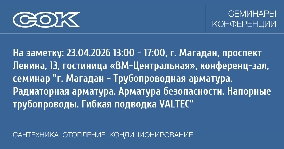 Семинар: г. Магадан - Трубопроводная арматура. Радиаторная арматура. Арматура безопасности. Напорные трубопроводы. Гибкая подводка VALTEC.