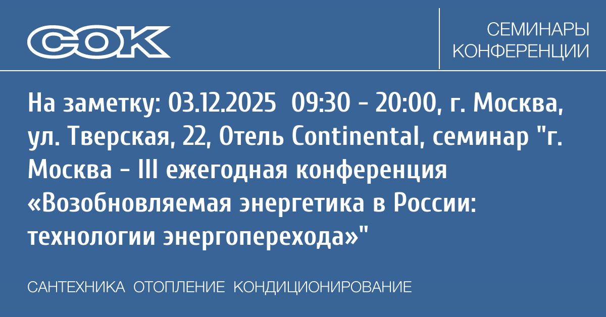 Ассоциация развития возобновляемой энергетики (АРВЭ) 3 декабря 2025 г. проводит III ежегодную конференцию «Возобновляемая энергетика России: технологии энергоперехода» в г. Москве в отеле Continental.