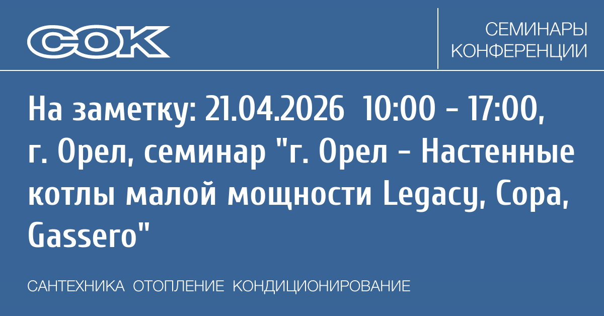 - 25.03.2026 10:00 - 17:00 Семинар г. Рязань - Настенные котлы малой мощности Legacy, Copa, Gassero