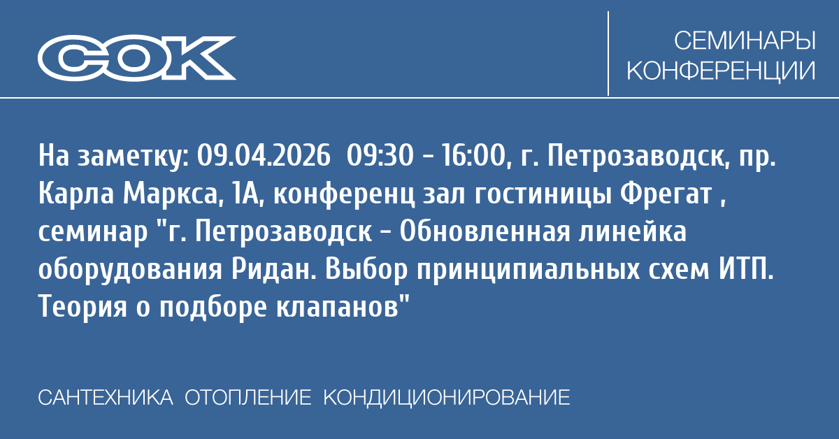Семинар: г. Петрозаводск - Обновленная линейка оборудования Ридан. Выбор принципиальных схем ИТП. Теория о подборе клапанов