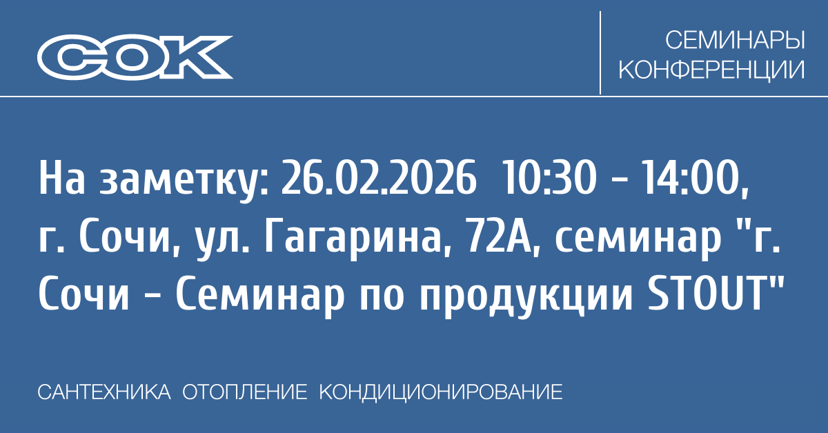 - 12:30–14:00 — Ассортимент продукции STOUT для ОТОПЛЕНИЯ, ТЁПЛЫХ ПОЛОВ И ВОДОСНАБЖЕНИЯ (2 часть). НОВИНКИ 2026. ВИЗ-интерактивный конкурс.