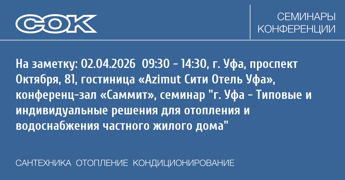 - 02.04.2026 09:30 - 14:30 Семинар г. Уфа - Типовые и индивидуальные решения для отопления и водоснабжения частного жилого дома