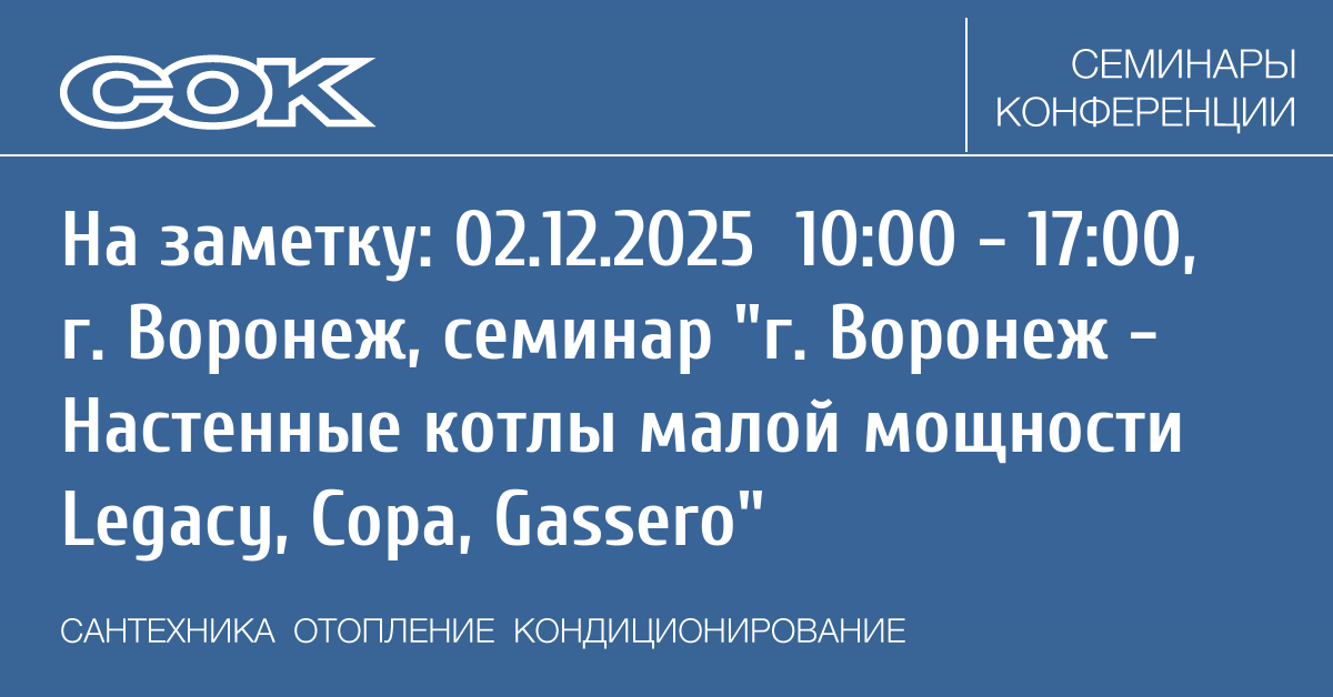 - 02.12.2025 10:00 - 17:00 Seminar г. Воронеж - Настенные котлы малой мощности Legacy, Copa, Gassero