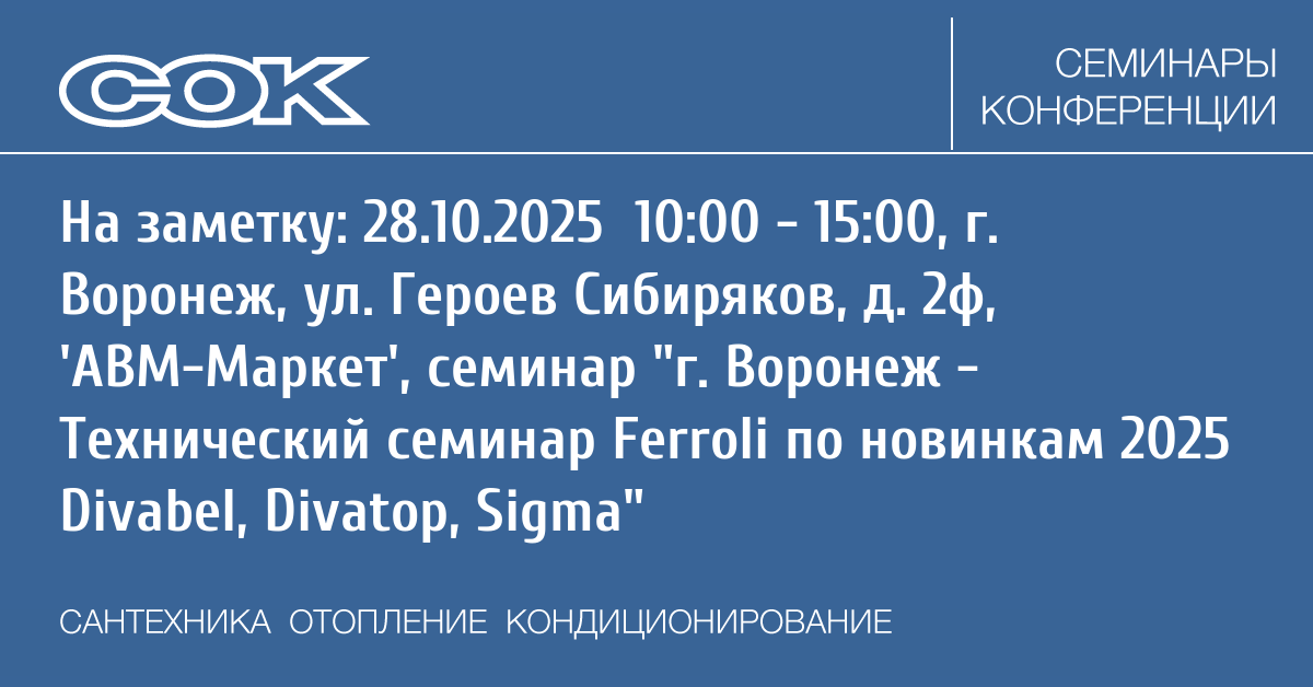 - 28.10.2025 10:00 - 15:00 Seminar г. Воронеж - Технический семинар по новинкам 2025 Divabel,Divatop,Sigma