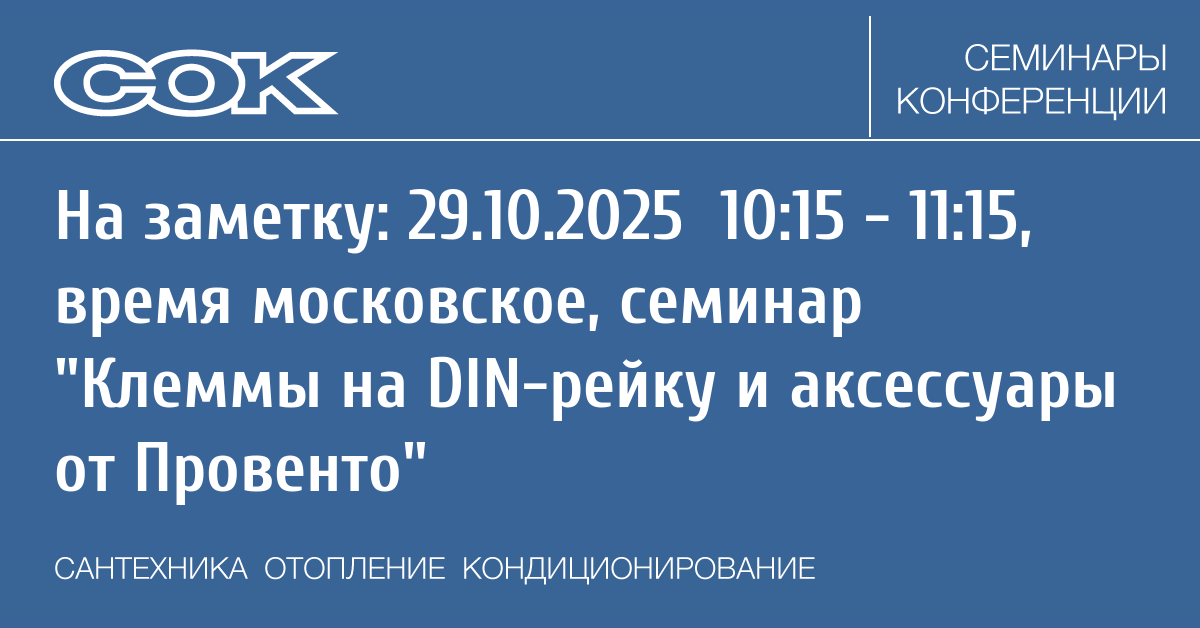 - 29.10.2025 10:15 - 11:15 Webinar Клеммы на DIN-рейку и аксессуары от Провенто