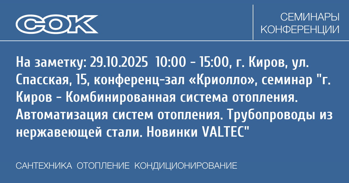 Seminar: г. Киров - Комбинированная система отопления. Автоматизация систем отопления. Трубопроводы из нержавеющей стали. Новинки VALTEC