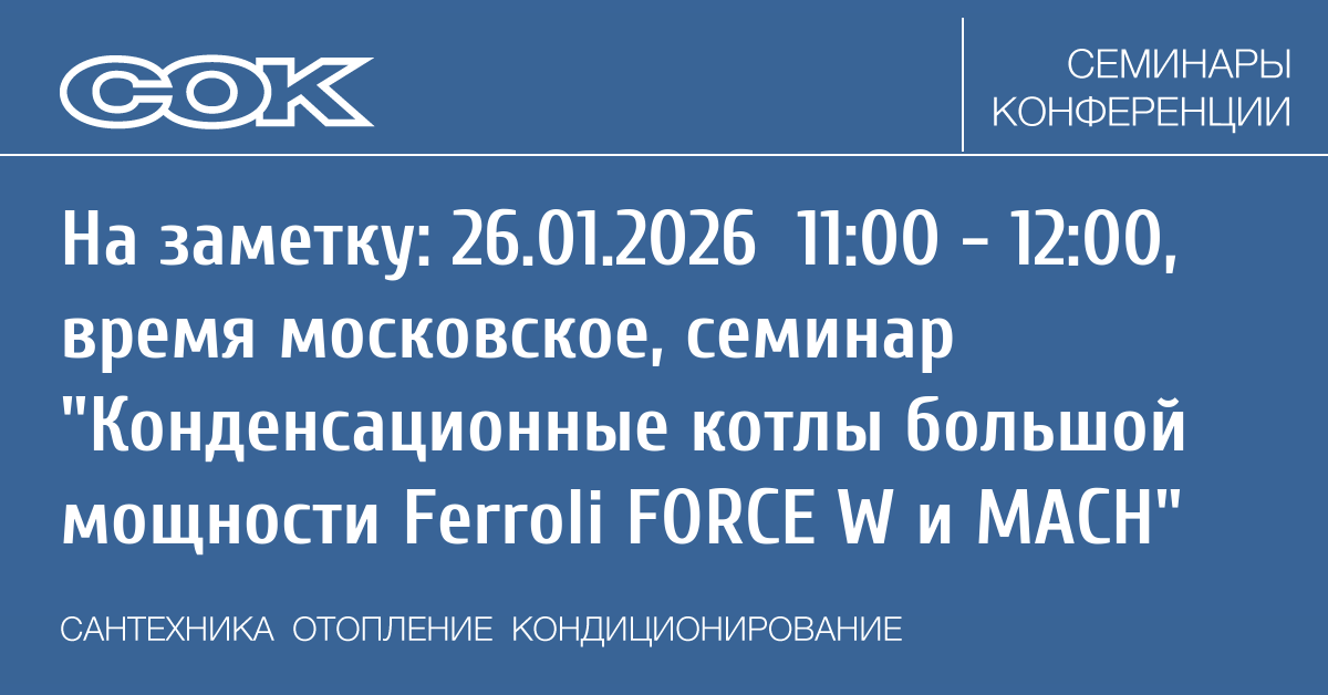 - 26.01.2026 11:00 - 12:00 Вебинар Конденсационные котлы большой мощности Ferroli FORCE W и MACH