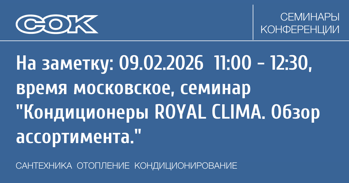 - 09.02.2026 11:00 - 12:30 Вебинар Кондиционеры ROYAL CLIMA. Обзор ассортимента.