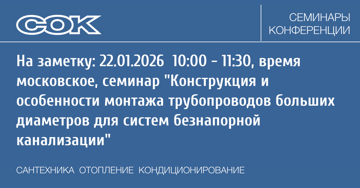 - 22.01.2026 10:00 - 11:30 Вебинар Конструкция и особенности монтажа трубопроводов больших диаметров для систем безнапорной канализации
