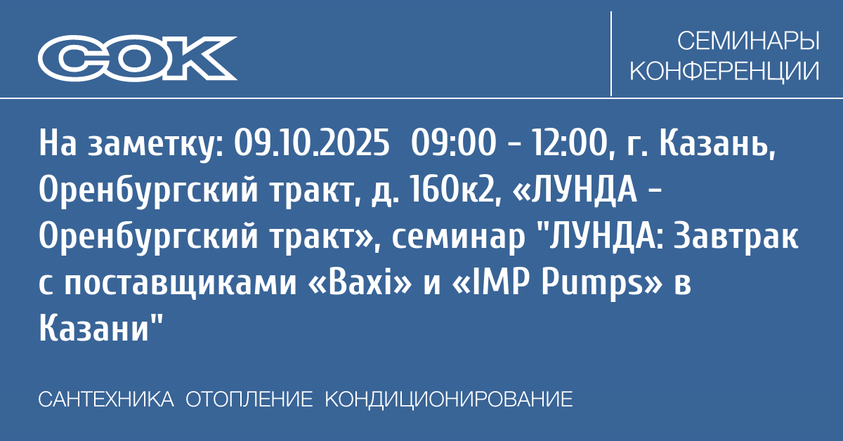 - 09.10.2025 09:00 - 12:00 Seminar ЛУНДА: Завтрак с поставщиками «Baxi» и «IMP Pumps» в Казани