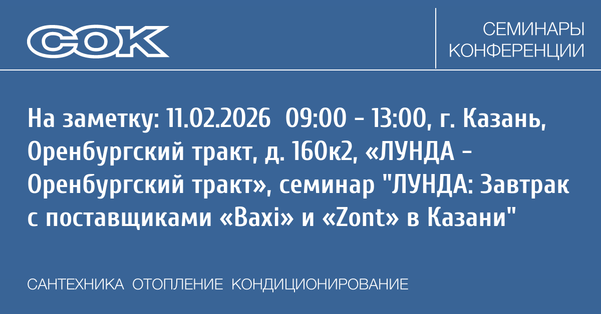 - 11.02.2026 09:00 - 13:00 Семинар ЛУНДА: Завтрак с поставщиками «Baxi» и «Zont» в Казани