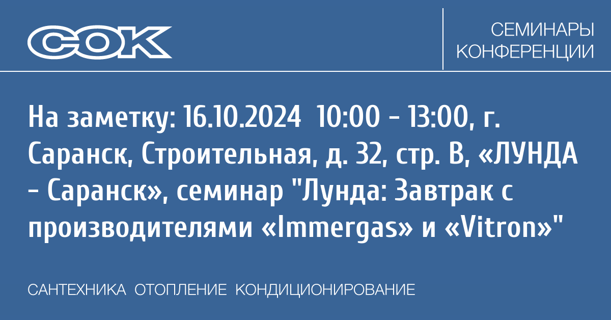 Компания Лунда совместно с производителями «Immergas» и «Vitron» проводит мероприятие, которое пройдёт в филиале «ЛУНДА — Саранск» 16 октября 2024 года.