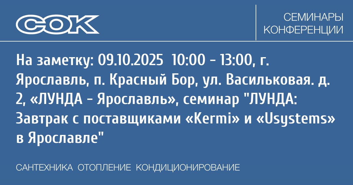 Компания Лунда совместно с поставщиками «Kermi» и «Usystems» проводит мероприятие, которое пройдёт в филиале «ЛУНДА — Ярославль» 9 октября 2025 года.