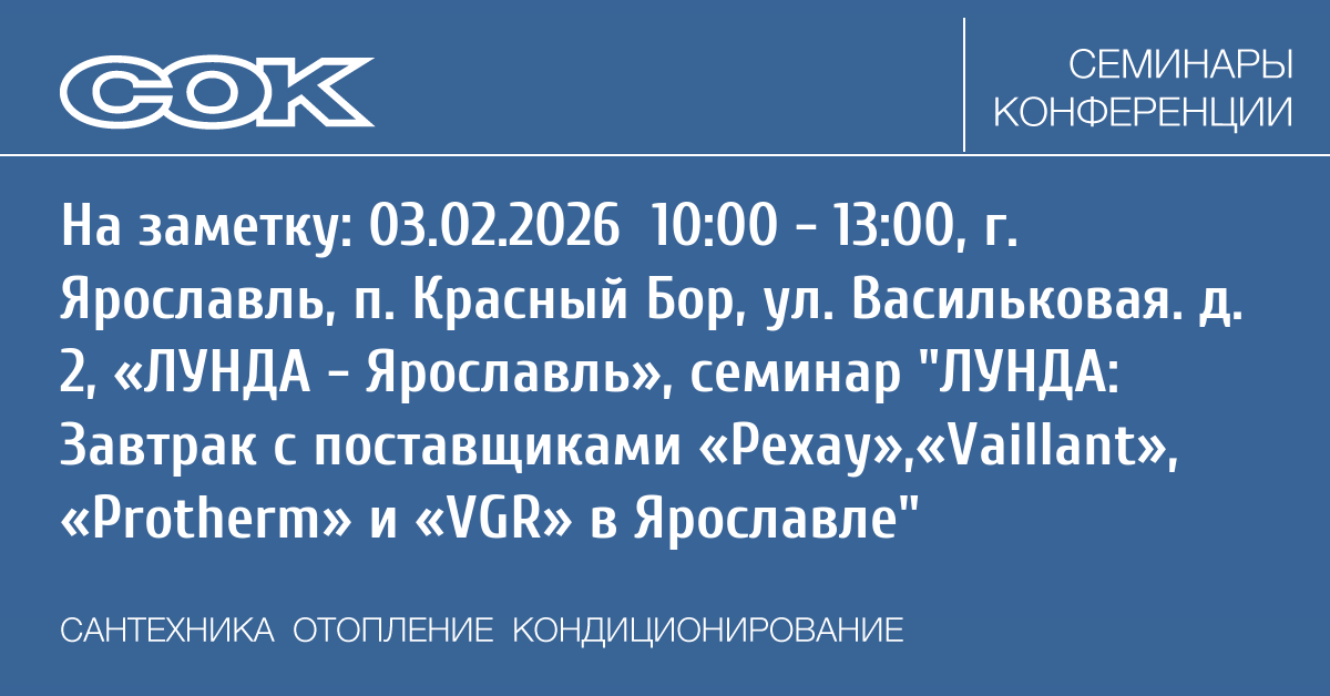 Компания Лунда совместно с поставщиками «Рехау»,«Vaillant», «Protherm» и «VGR» проводит мероприятие, которое пройдёт в филиале «ЛУНДА — Ярославль» 3 февраля 2026 года.