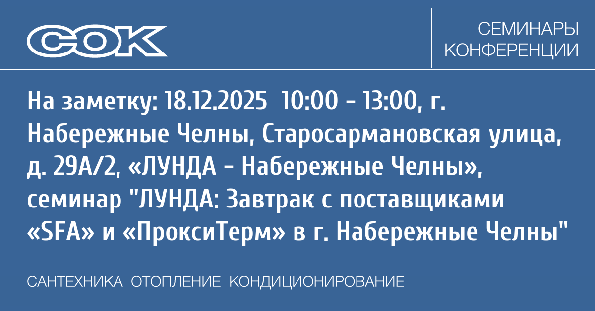 Компания Лунда совместно с поставщиками «SFA» и «ПроксиТерм» проводит мероприятие, которое пройдёт в филиале «ЛУНДА — Набережные Челны» 18 декабря 2025 года.