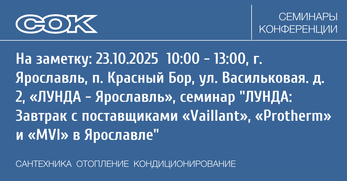 Компания Лунда совместно с поставщиками «Vaillant», «Protherm» и «MVI» проводит мероприятие, которое пройдёт в филиале «ЛУНДА — Ярославль» 23 октября 2025 года.