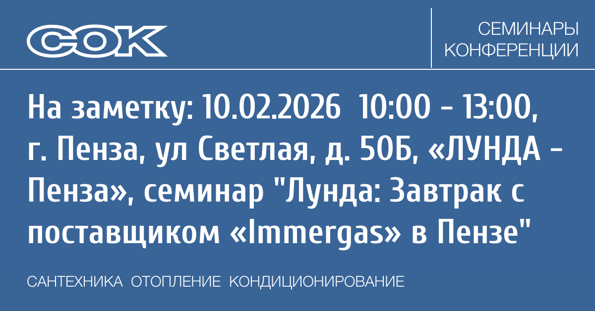 Компания Лунда совместно с поставщиком «Immergas» проводит мероприятие, которое пройдёт в филиале «ЛУНДА — Пенза» 10 февраля 2026 года.