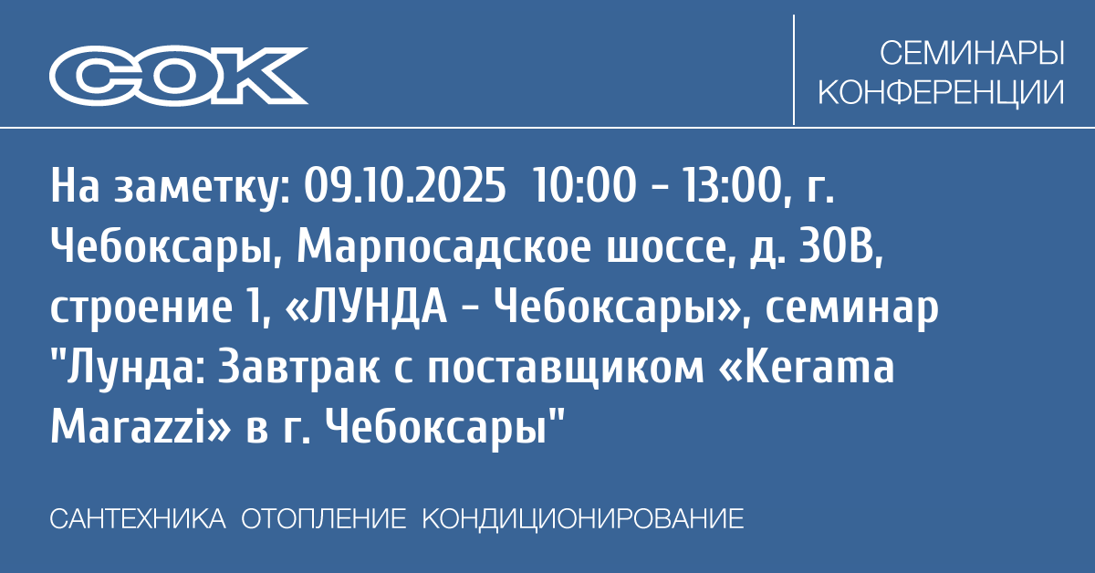 - 09.10.2025 10:00 - 13:00 Seminar Лунда: Завтрак с поставщиком «Kerama Marazzi» в г. Чебоксары
