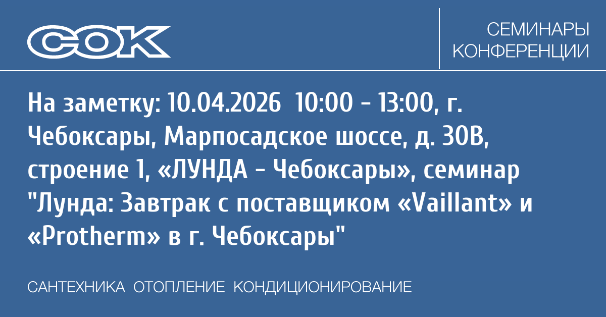 Компания Лунда совместно с поставщиком «Vaillant» и «Protherm» проводит мероприятие, которое пройдёт в филиале «ЛУНДА — Чебоксары» 10 апреля 2026 года.