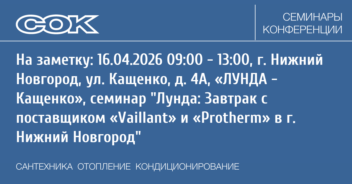 Компания Лунда совместно с поставщиком «Vaillant» и «Protherm» проводит мероприятие, которое пройдёт в филиале «ЛУНДА — Кащенко» 16 апреля 2026 года.