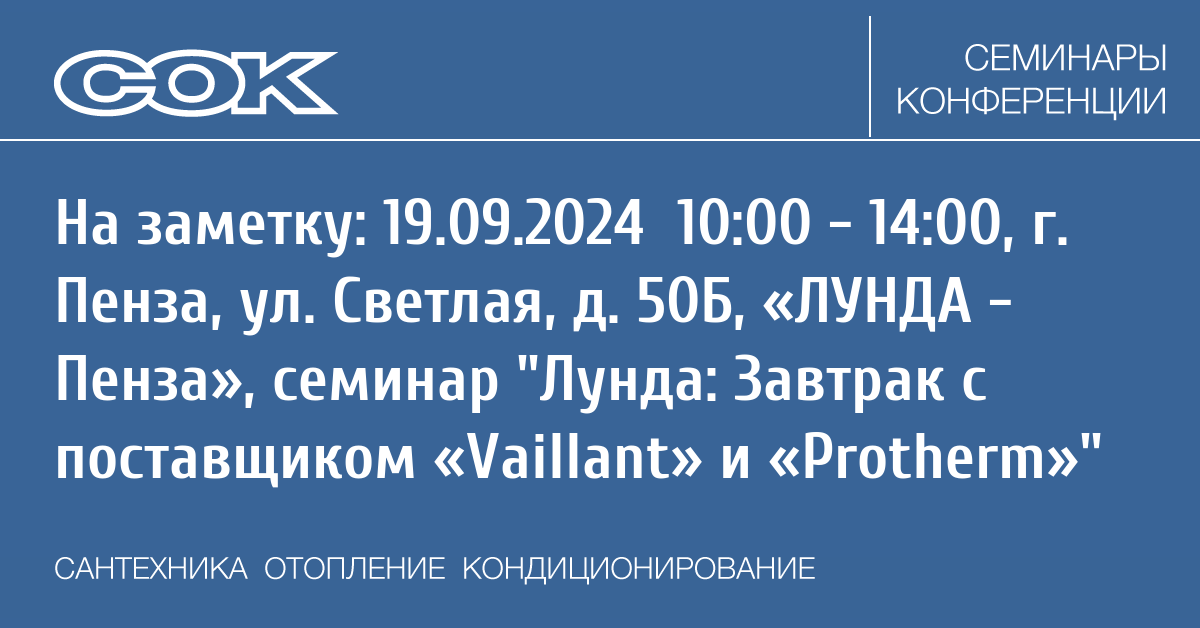 Компания Лунда совместно с поставщиком «Vaillant» и «Protherm» проводит мероприятие, которое пройдёт в филиале «ЛУНДА — Пенза» 19 сентября 2024 года.