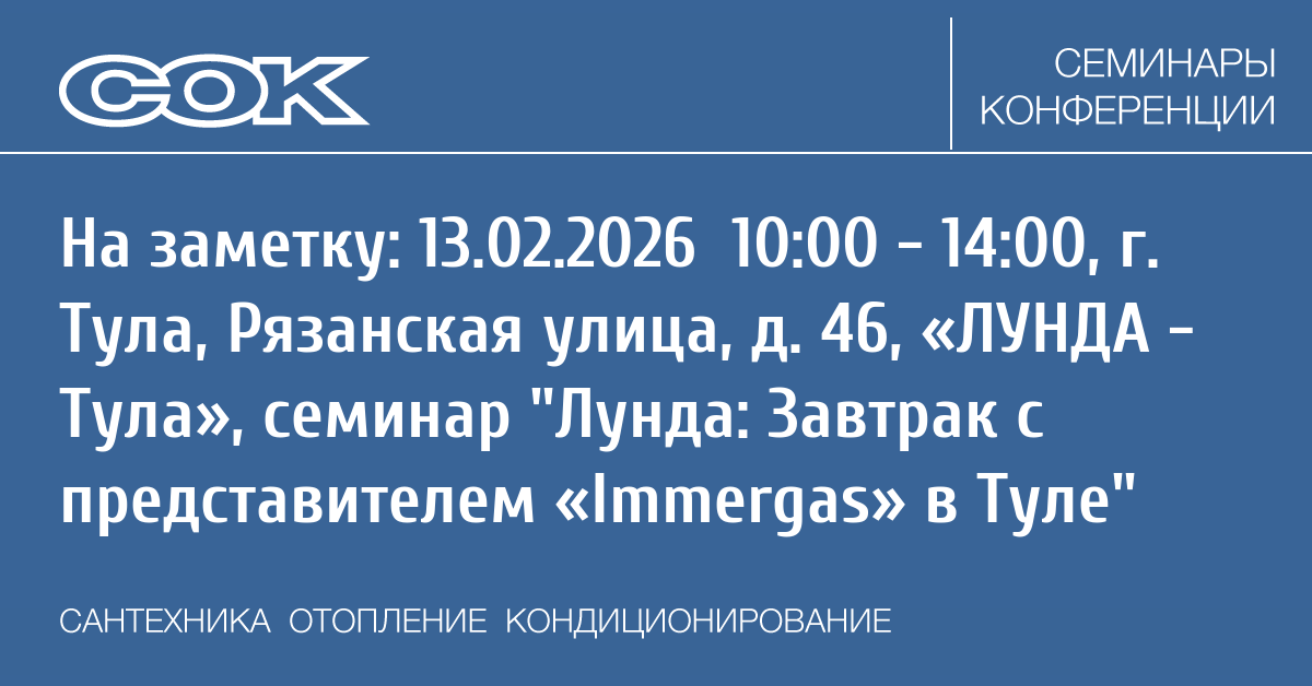 Компания Лунда совместно с представителем «Immergas» проводит мероприятие, которое пройдёт в филиале «ЛУНДА — Тула» 13 февраля 2026 года.