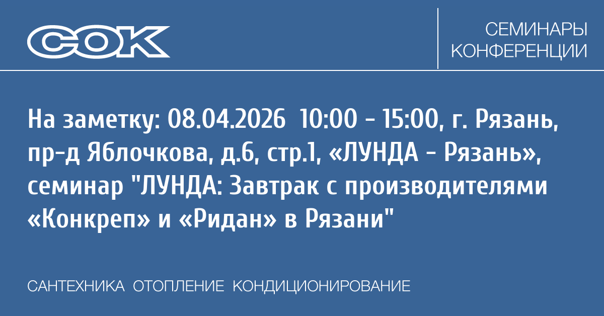 Компания Лунда совместно с производителями брендов «Конкреп» и «Ридан» проводит мероприятие, которое пройдёт в филиале «ЛУНДА — Рязань» 8 апреля 2026 года.