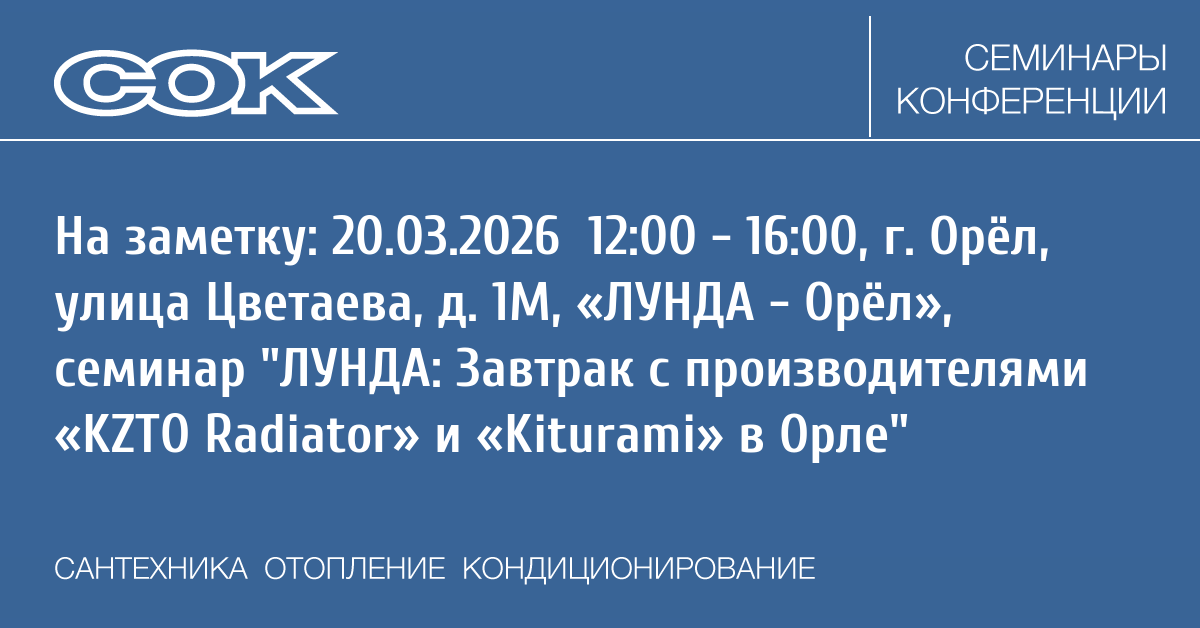 - 20.03.2026 12:00 - 16:00 Семинар ЛУНДА: Завтрак с производителями «KZTO Radiator» и «Kiturami» в Орле