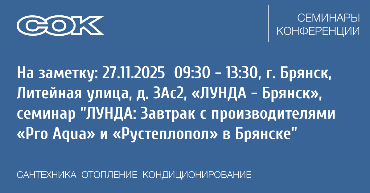 - 27.11.2025 09:30 - 13:30 Seminar ЛУНДА: Завтрак с производителями «Pro Aqua» и «Рустеплопол» в Брянске