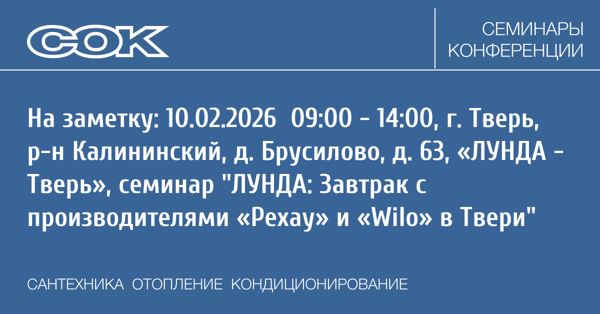 - 10.02.2026 09:00 - 14:00 Семинар ЛУНДА: Завтрак с производителями «Рехау» и «Wilo» в Твери