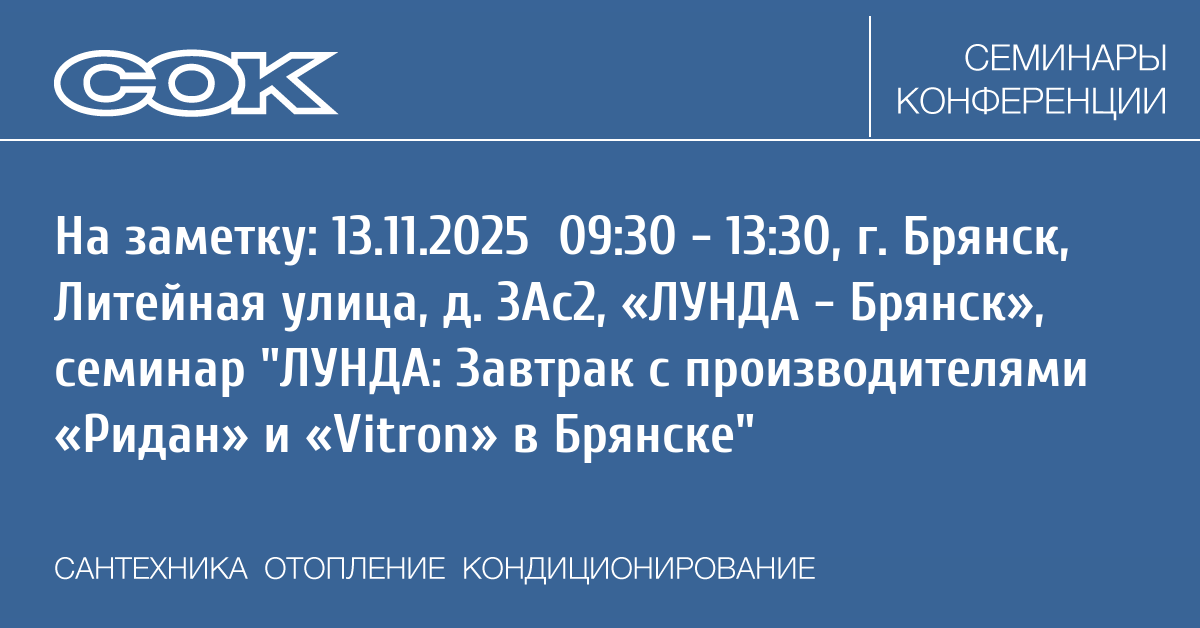Компания Лунда совместно с производителями «Ридан» и «Vitron» проводит мероприятие, которое пройдёт в филиале «ЛУНДА — Брянск» 13 ноября 2025 года.