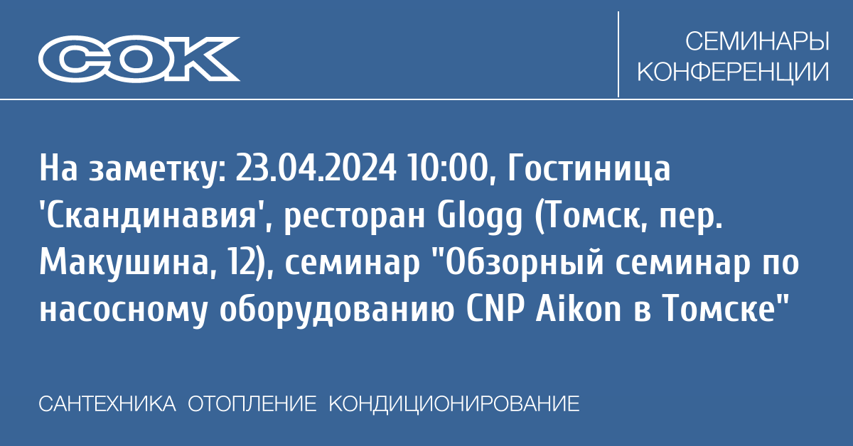 23 апреля в Томске состоится обзорный семинар по насосному оборудованию CNP Aikon.