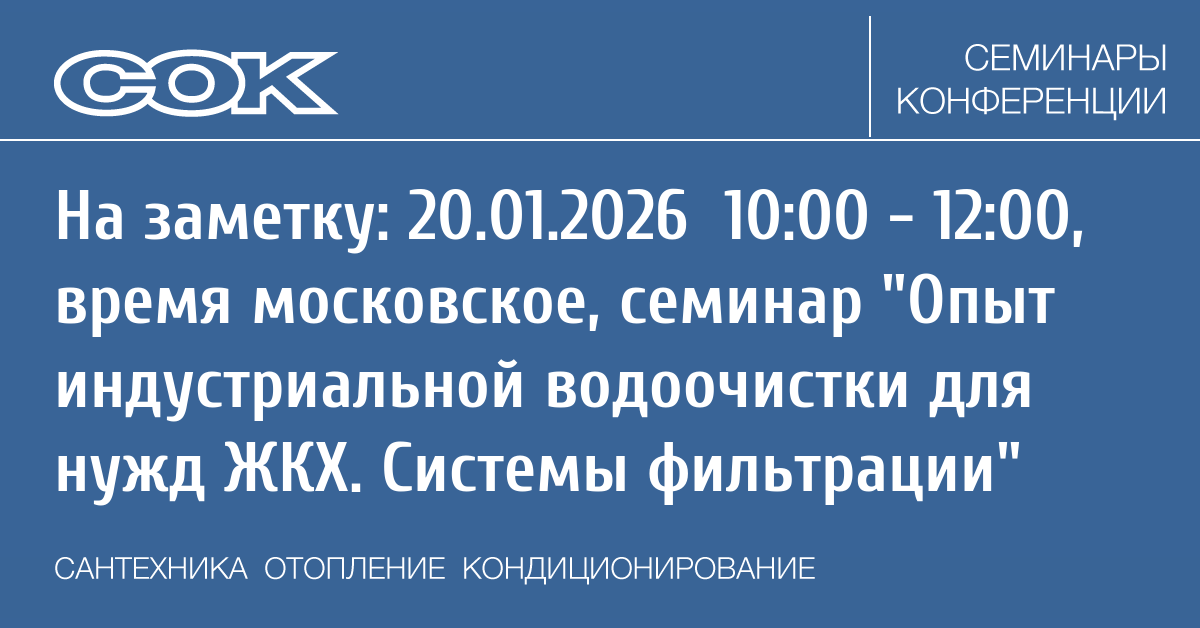 - 20.01.2026 10:00 - 12:00 Вебинар Опыт индустриальной водоочистки для нужд ЖКХ. Системы фильтрации