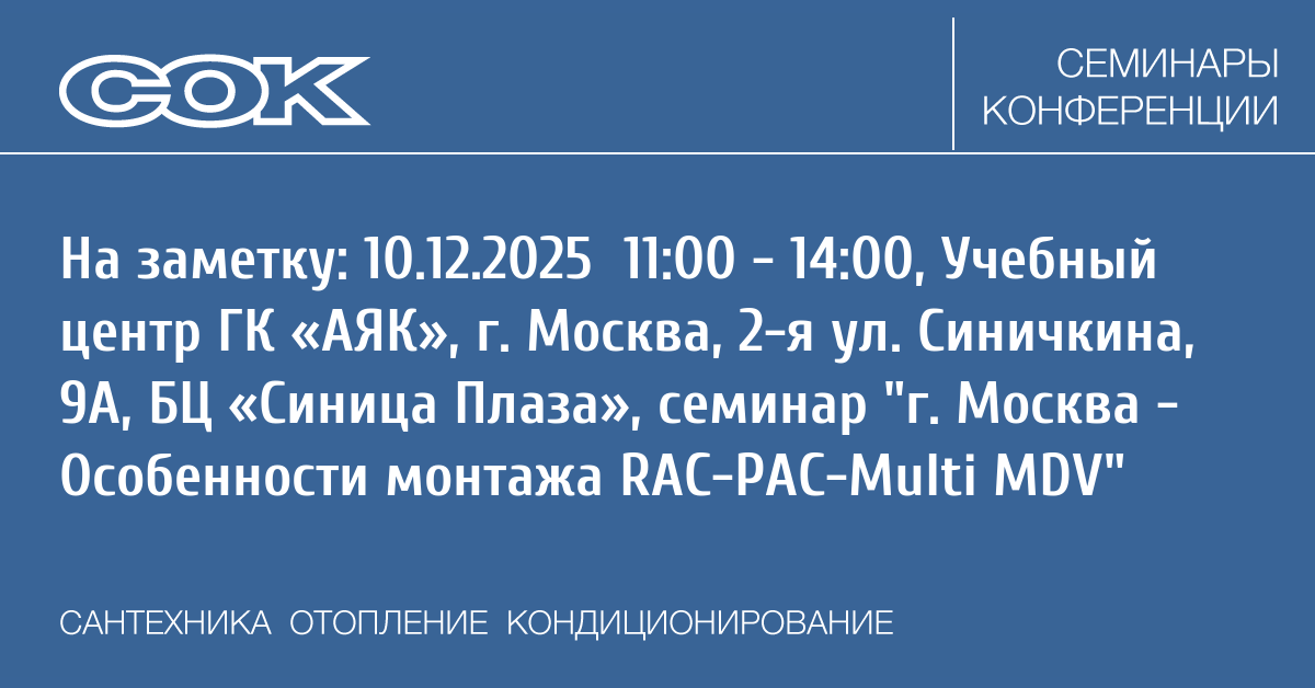 - 10.12.2025 11:00 - 14:00 Seminar Особенности монтажа RAC-PAC-Multi MDV