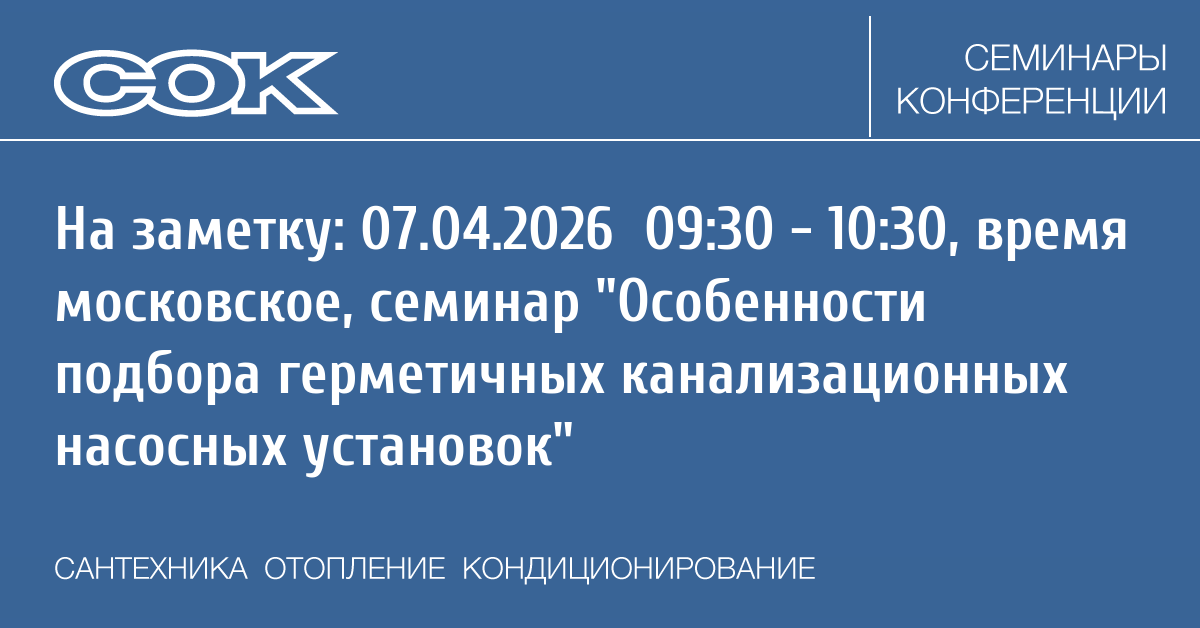 - 07.04.2026 09:30 - 10:30 Вебинар Особенности подбора герметичных канализационных насосных установок