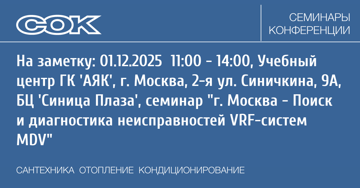 - 01.12.2025 14:00 - 15:00 Seminar г. Москва - Экскурсия в Учебном центре ГК «АЯК» HVAC AСADEMY MDV