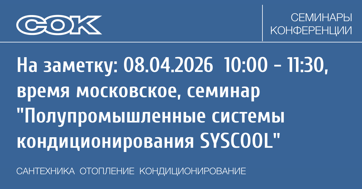 - 25.03.2026 09:30 - 18:00 Семинар г. Владивосток - Инженерно-технические решения в области холодоснабжения и кондиционирования, обзор текущих тенденций в развитии холодильных компонентов