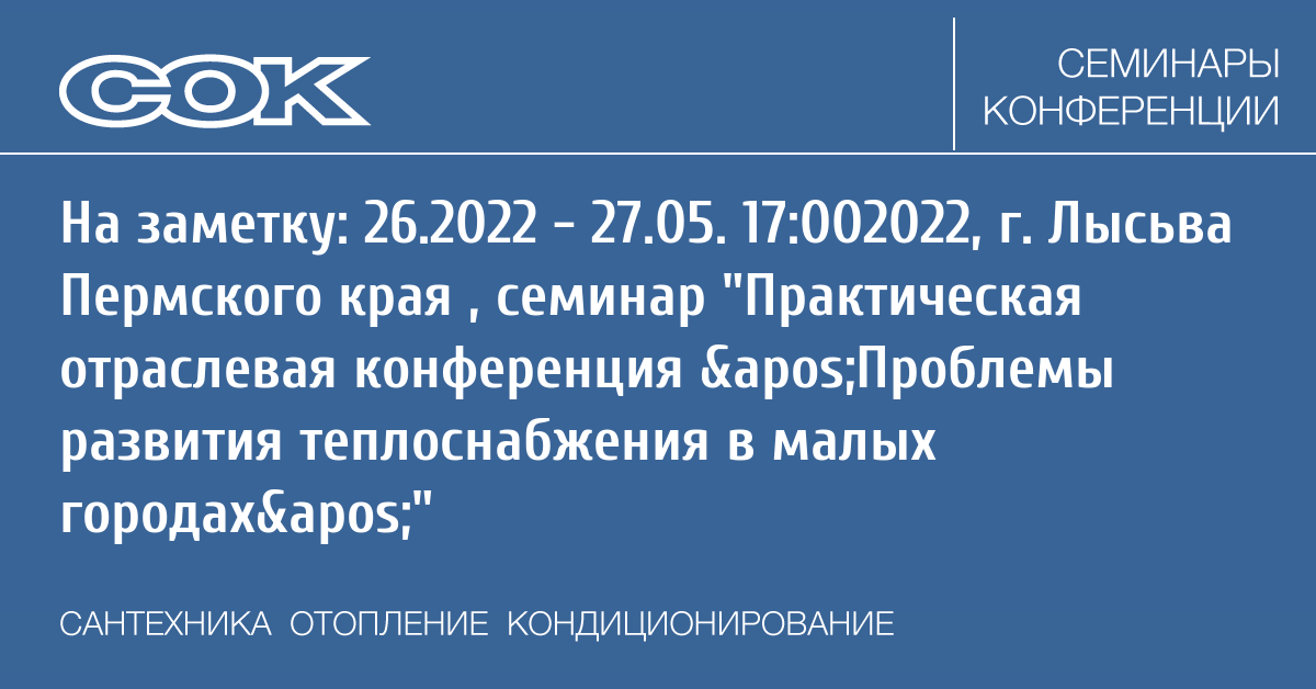 26–27 мая в городе Лысьва Пермского края при поддержке Фонда «Центр стратегических разработок» состоится практическая отраслевая конференция «Проблемы развития теплоснабжения в малых городах». Цель конференции — обмен мнениями и опытом модернизации как с точки зрения технологических, так и управленческих и финансовых мероприятий.