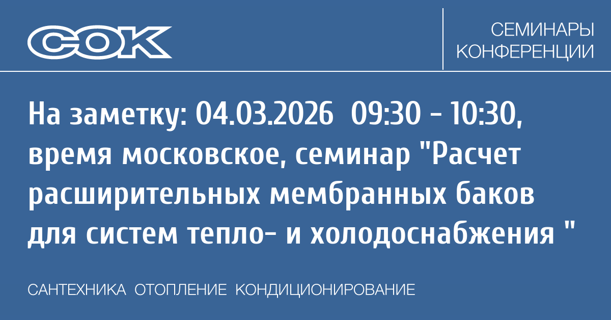 - 04.03.2026 09:30 - 10:30 Вебинар Расчет расширительных мембранных баков для систем тепло- и холодоснабжения