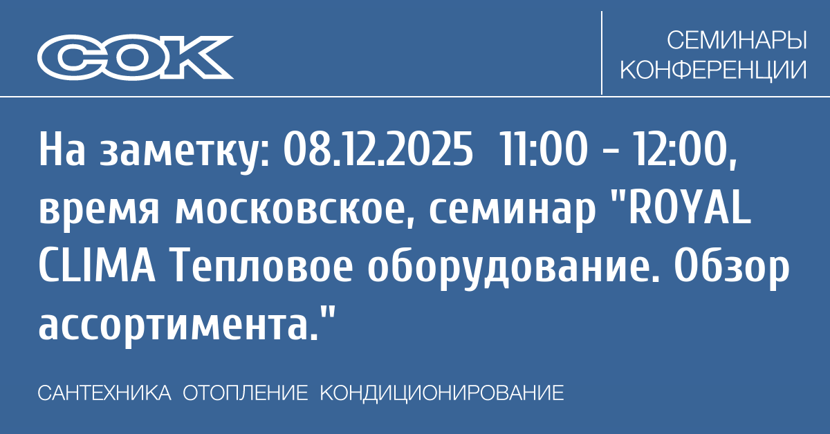 - 08.12.2025 11:00 - 12:00 Webinar ROYAL CLIMA Тепловое оборудование. Обзор ассортимента.