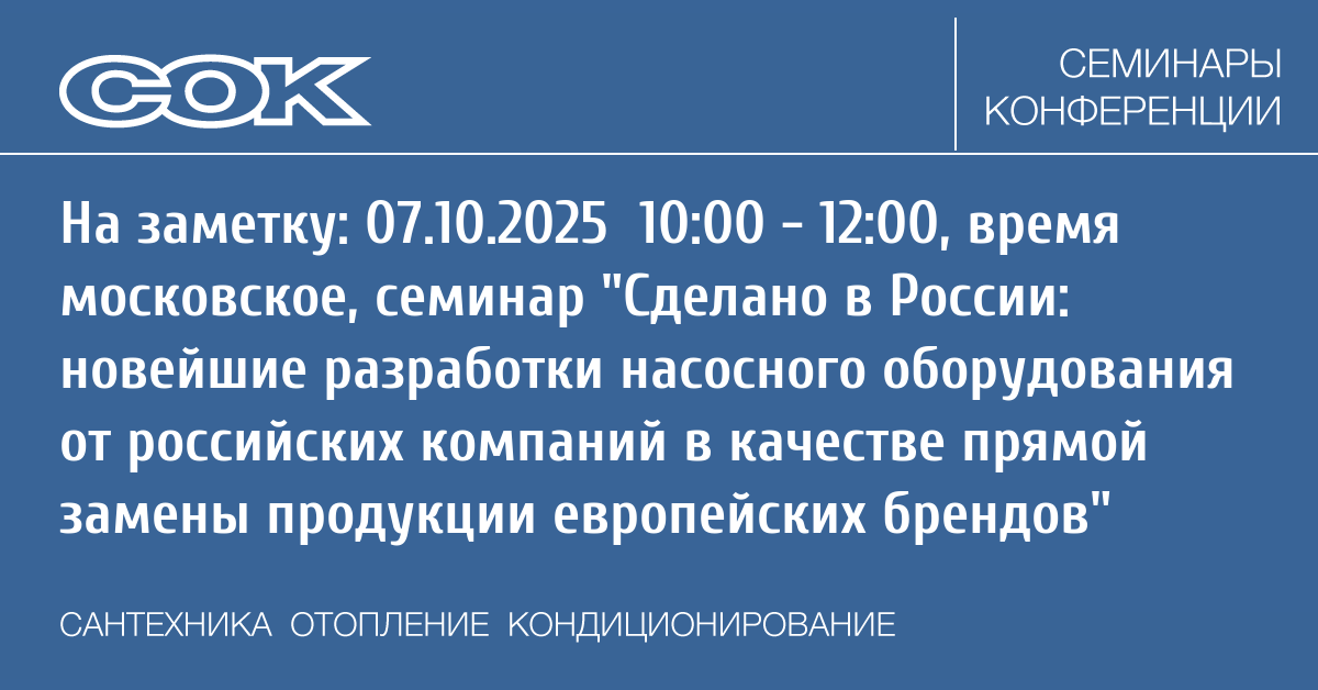 - 07.10.2025 10:00 - 12:00 Webinar Сделано в России: новейшие разработки насосного оборудования от российских компаний в качестве прямой замены продукции европейских брендов