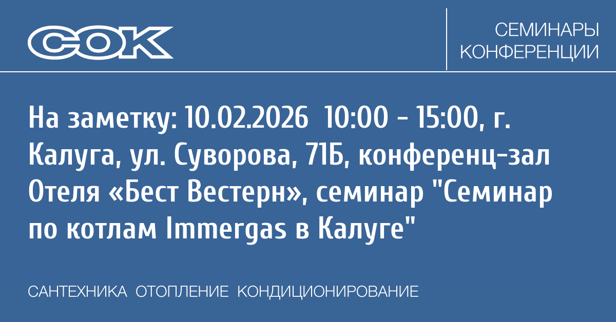 - 10.02.2026 10:00 - 15:00 Семинар Семинар по котлам Immergas в Калуге