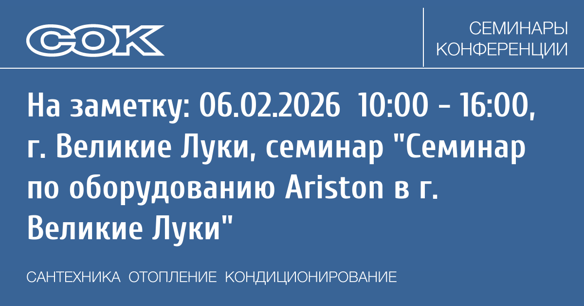 - 06.02.2026 10:00 - 16:00 Семинар Семинар по оборудованию Ariston в г. Великие Луки