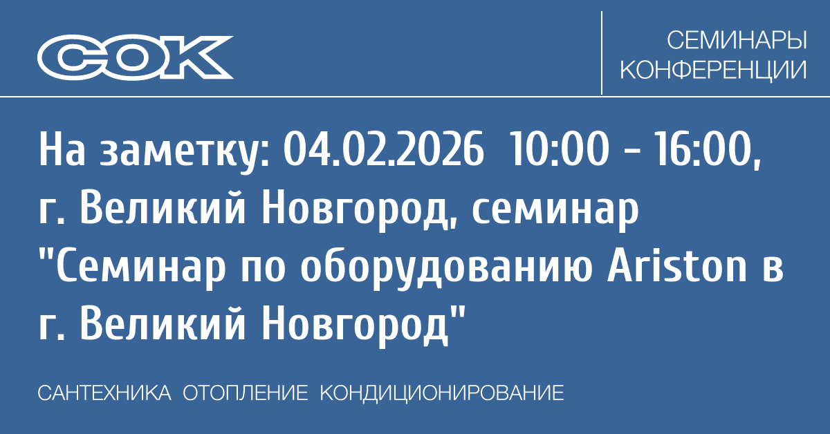 - 04.02.2026 10:00 - 16:00 Семинар Семинар по оборудованию Ariston в г. Великий Новгород