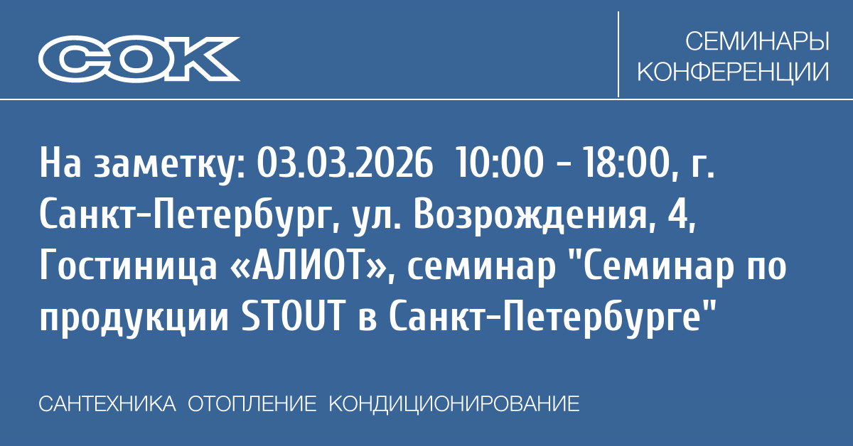 - 03.03.2026 10:00 - 18:00 Семинар Семинар по продукции STOUT в Санкт-Петербурге