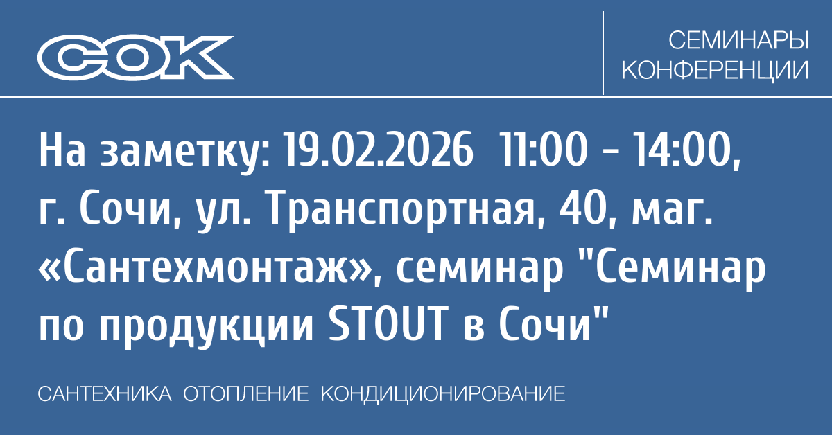- 15:00–16:00 — Ассортимент продукции STOUT для ОТОПЛЕНИЯ ТЁПЛЫХ ПОЛОВ И ВОДОСНАБЖЕНИЯ (2 часть).