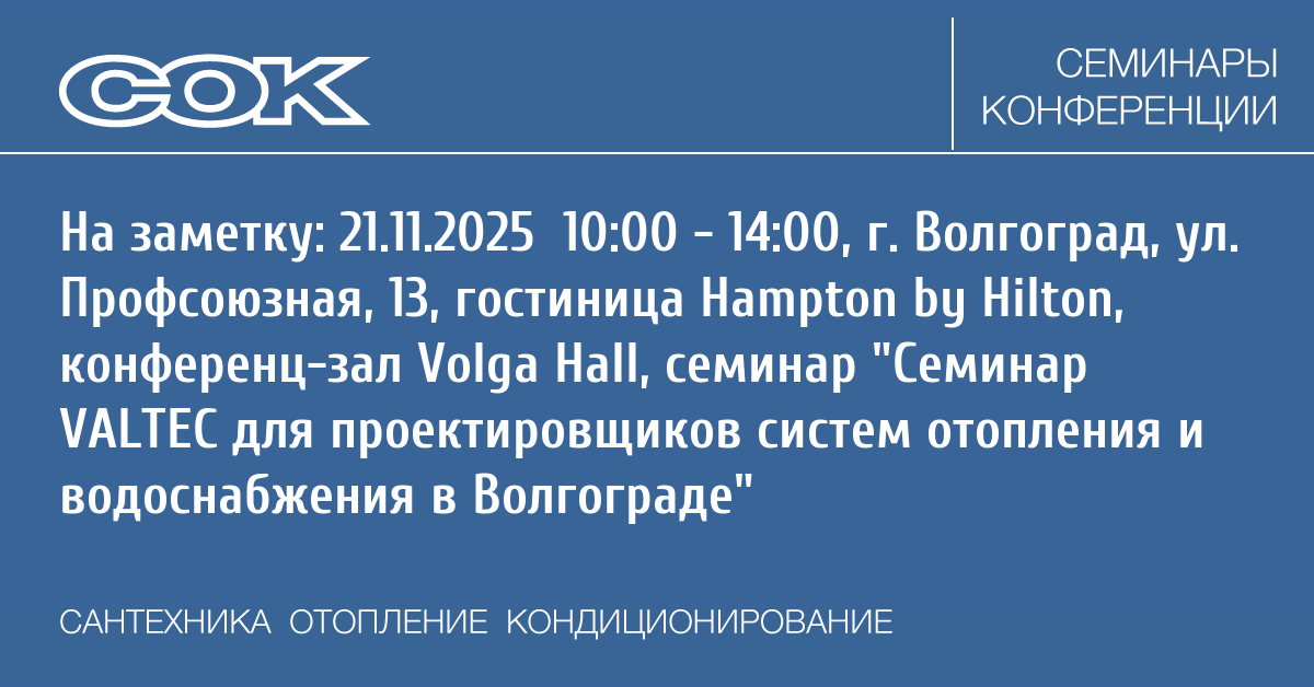 - 21.11.2025 10:00 - 14:00 Seminar Семинар VALTEC для проектировщиков систем отопления и водоснабжения в Волгограде