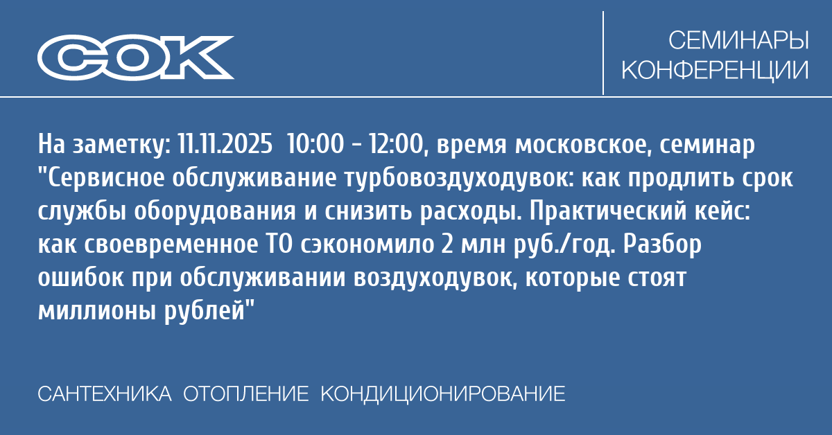 - 11.11.2025 10:00 - 12:00 Webinar Сервисное обслуживание турбовоздуходувок: как продлить срок службы оборудования и снизить расходы. Практический кейс: как своевременное ТО сэкономило 2 млн руб./год. Разбор ошибок при обслуживании воздуходувок, которые стоят миллионы рублей
