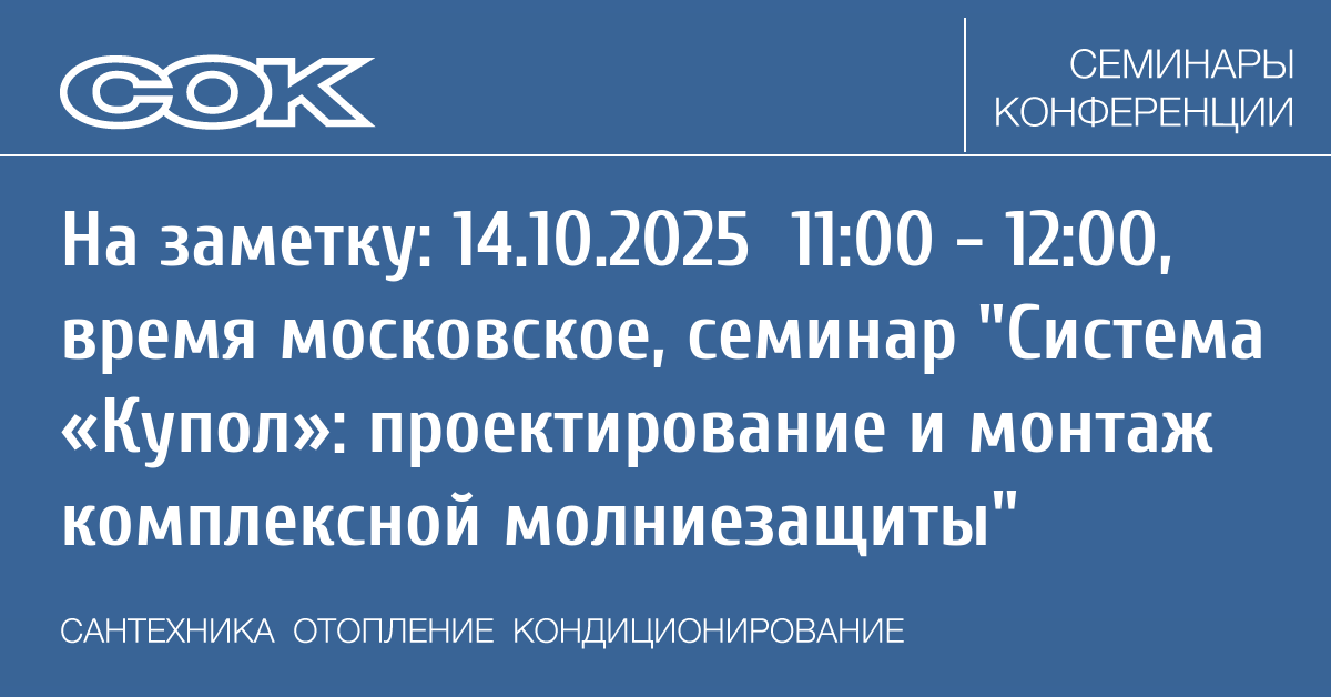 - 14.10.2025 11:00 - 12:00 Webinar Система «Купол»: проектирование и монтаж комплексной молниезащиты