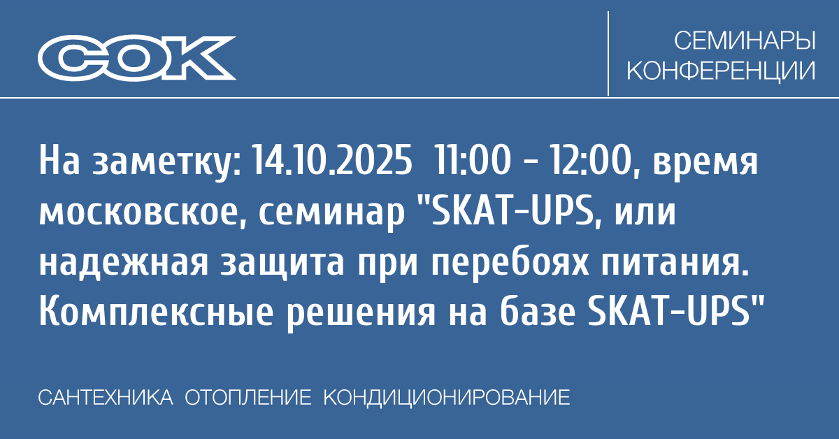 - 14.10.2025 11:00 - 12:00 Webinar SKAT-UPS, или надежная защита при перебоях питания. Комплексные решения на базе SKAT-UPS